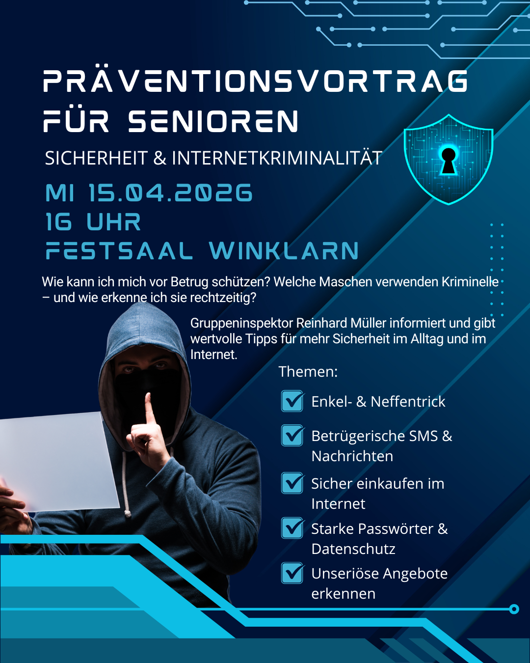 In unserem Präventionsvortrag „Sicherheit und Internetkriminalität“ zeigt Gruppeninspektor Reinhard Müller (Polizeiinspektion Amstetten), wie Betrüger vorgehen und wie man sich effektiv schützt.
