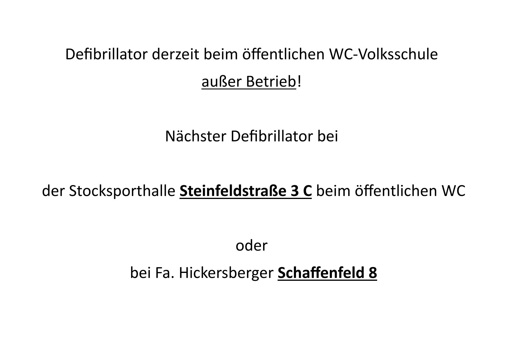 Nächster Defibrillator bei der Stocksporthalle Steinfeldstraße 3C beim öffentlichen WC oder bei Fa. Hickersberger Schaffenfeld 8.