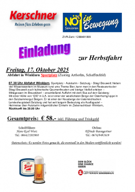 Fr. | 17. | Herbstfahrt der Senioren nach Salzburg (Stiegl Brauwelt + Gaisberg) | |
