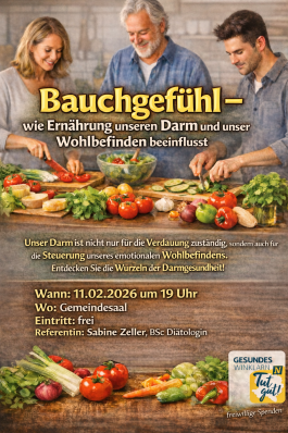 | Mi. | 11. | Vortrag: "Bauchgefühl - wie Ernährung unseren Darm und unser Wohlbefinden beeinflusst" - Festsaal Gemeinde Winklarn | |
